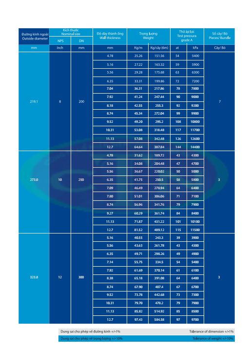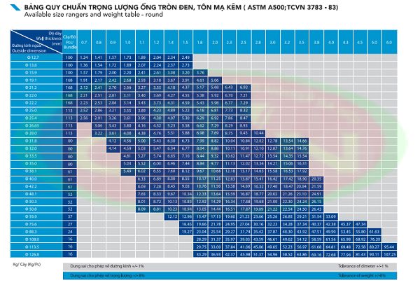 - Quy cách thép ống tròn đen cỡ nhỏ và vừa theo tiêu chuẩn ASTM A500; TCNVN 3783-83: