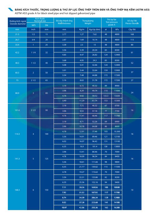 - Quy cách ống thép tròn đen theo tiêu chuẩn ASTM A53 bao gồm từ ống thép đen cỡ nhỏ đến ống thép đen cỡ lớn: